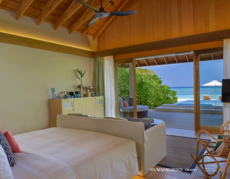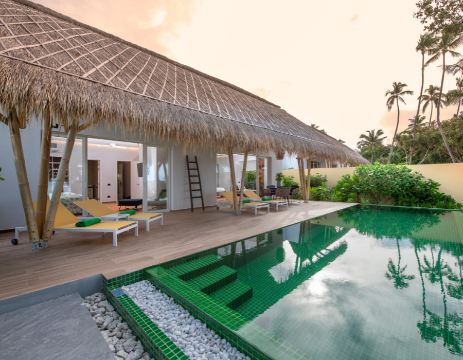 Kids have a bedroom in the same Villa with their own toilet and shower and direct access to the family pool, giving them autonomy as well as an adult supervisor. Partially covered and open patios and a private infinity pool with a garden allows for front-row access to Emerald Faarufushi’s white-sandy beach, the perfect choice for families with kids.