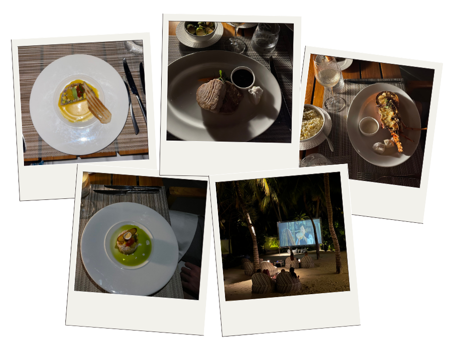 Dinner at Sand, Velassaru’s iconic feet-in-the-sand dining experience, was magical. Our private gazebo created an intimate atmosphere, and standout dishes included reef fish ceviche, tuna tartar, half-pound lobster and tiramisu. We even stumbled upon cinema under the stars on our walk back.