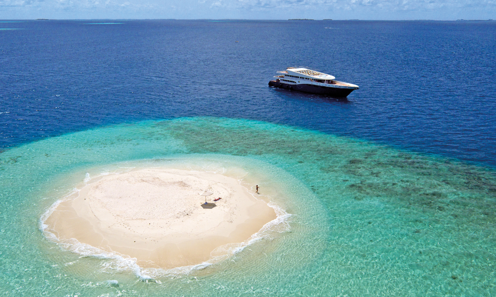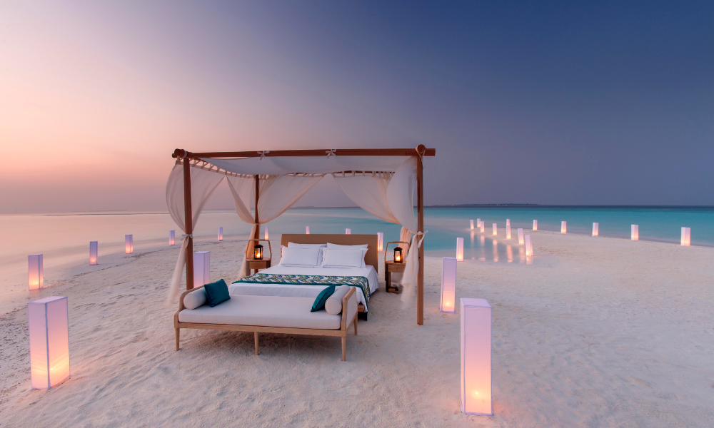 Milaidhoo offers couples a private overnight stay on a secluded sandbank. Complete with a four-poster bed, sunset cruise, private dining, and full villa-style amenities supported by an anchored yacht or dhoni, it is an exclusive experience of total privacy beneath the stars.