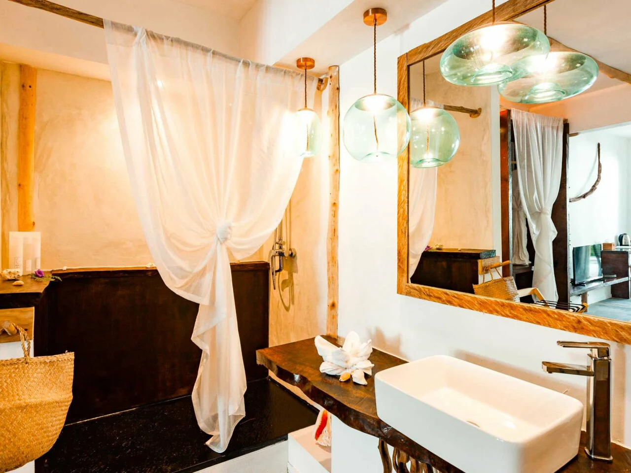 (32m2+ 6m2 terrace) feature an open plan bathroom as well as a terrace with a view on a little tropical garden and 20 meters away from the beach.