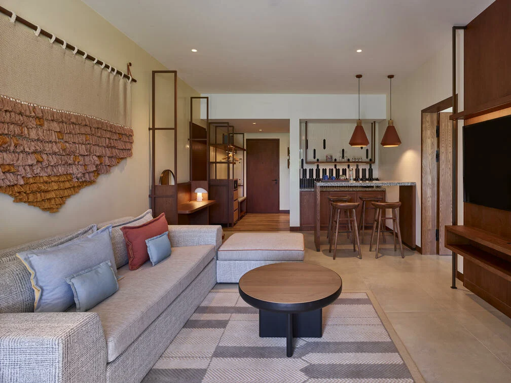 Unwind in this spacious and comfortable suite that features two bedrooms one with one king-sized bed and the other with two queen-sized beds. Each room also has a walk-in wardrobe and its own bathroom with a walk-in shower. The bathroom in the master bedroom also has a bathtub. This suite benefits from a separate living area with a sofa bed and an extra bathroom for guests. Enjoy a meal around the dining table, which seats 8. A 32 sq. m. terrace with sun beds gives you ample outdoor space for relaxing.