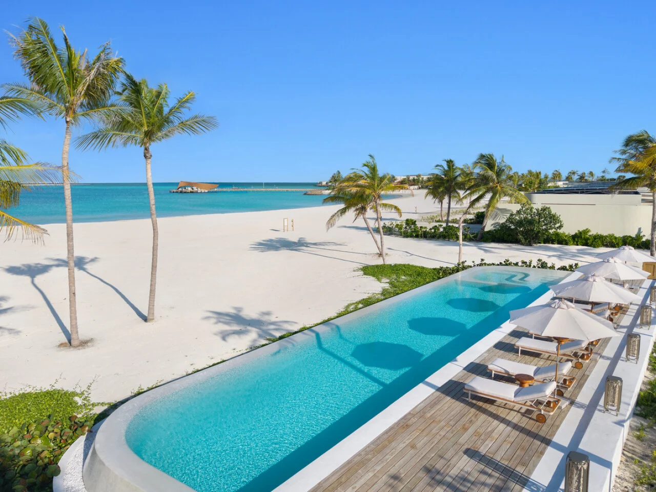 Experience sophisticated living in the Three-Bedroom Sunset Beach Pool Residence, a stunning 260 sqm residence designed for families or larger groups with a private outdoor deck and swimming pool and direct beach access. Accommodating up to 7 adults, guests will enjoy the modern comforts of three spacious bedrooms, contemporary bathrooms, a separate living and dining area, kitchenette, flat-screen TVs and more.