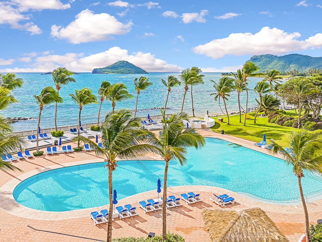 Located on the ground level of the hotel with views of lush tropical landscaping and glimpses of the ocean. Rooms offer tile flooring and separate sitting area with private patio. Furnishings include king or two queen beds, ceiling fan, air conditioning, hair dryer, iron and board, safe, flat screen TV, radio alarm, mini refrigerator, and coffee/tea service.