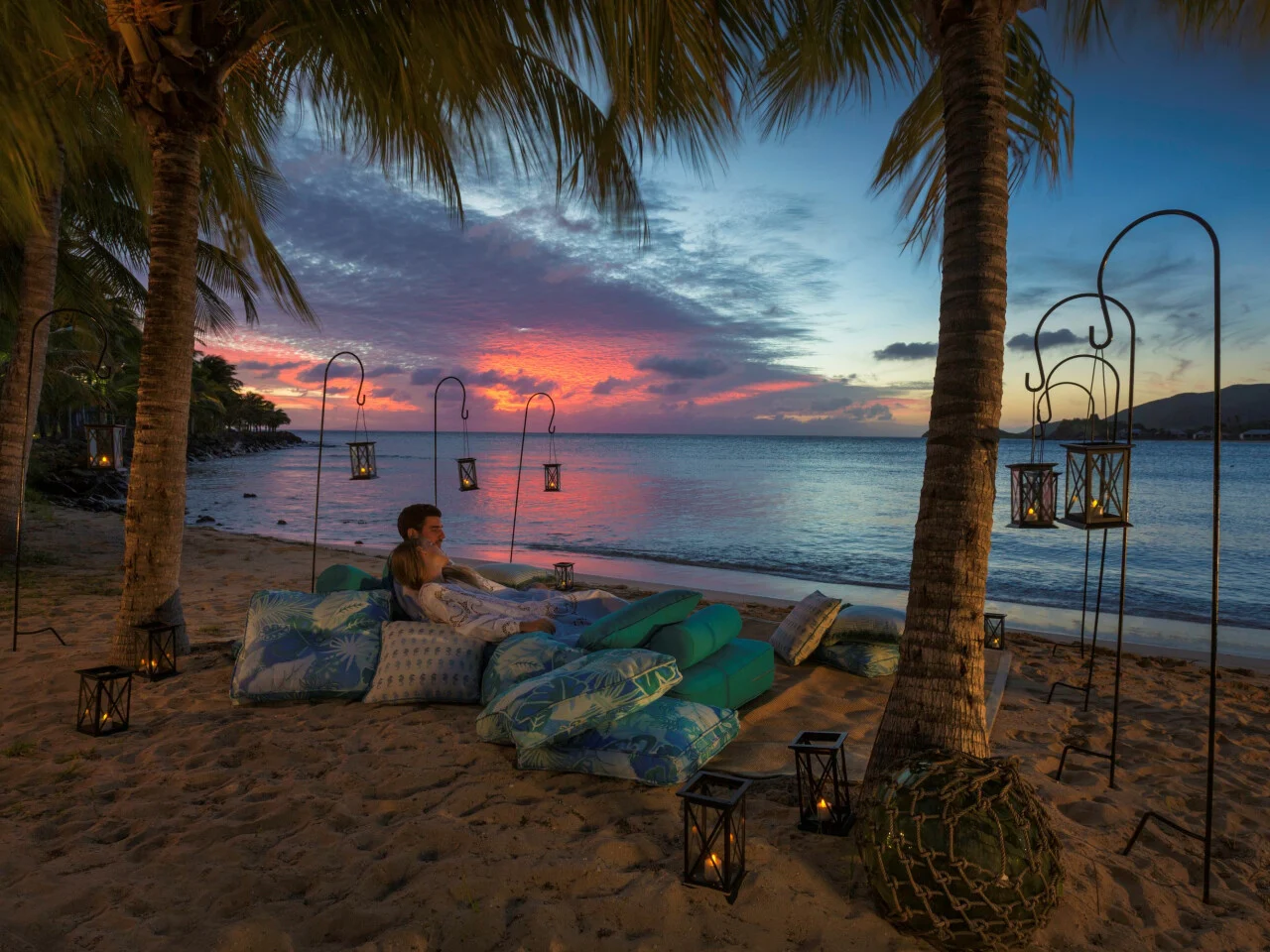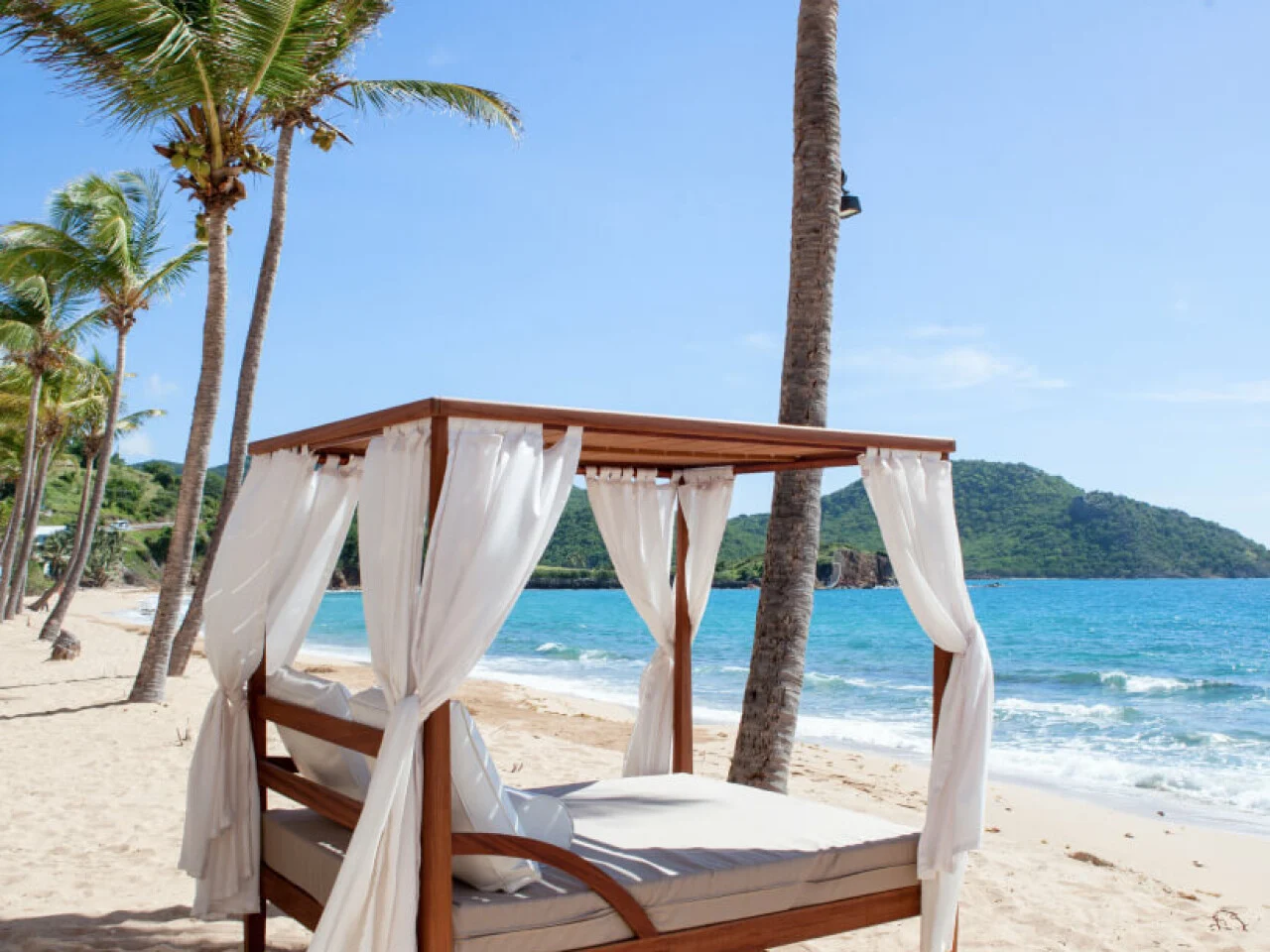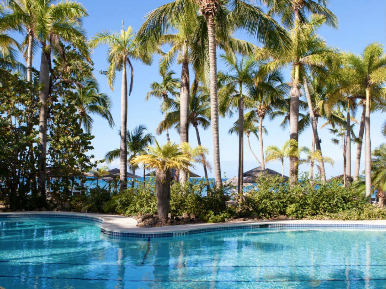 This pair of generously scaled suites occupies the third floor of a Caribbean-style villa directly on the sands of the resort’s surf beach. Both suites are luxuriously outfitted with blue-marble bathrooms, colonial furniture, richly colored fabrics and lush palms. The bedroom and adjoining living room open onto a sweeping veranda with lounge chairs and a private plunge pool, the perfect site for private sunbathing or romantic cocktails under the stars. The Grace & Morris Bay suites can be linked to a junior suite to create a two-bedroom suite. Extended groups and families can reserve the entire floor (four bedrooms).