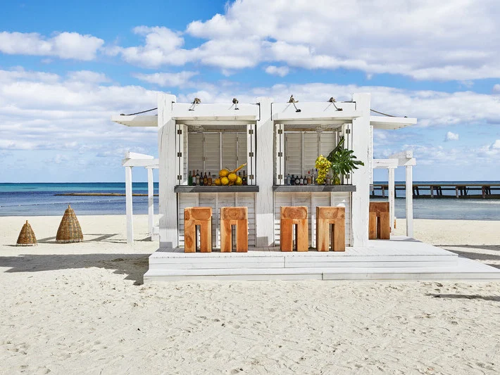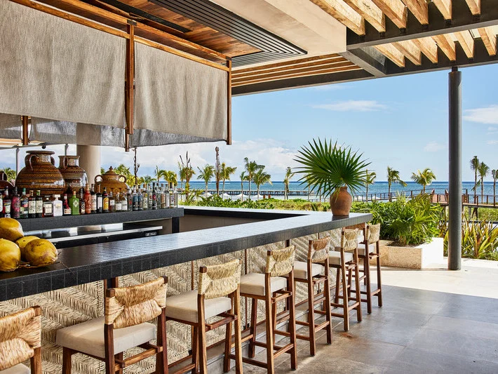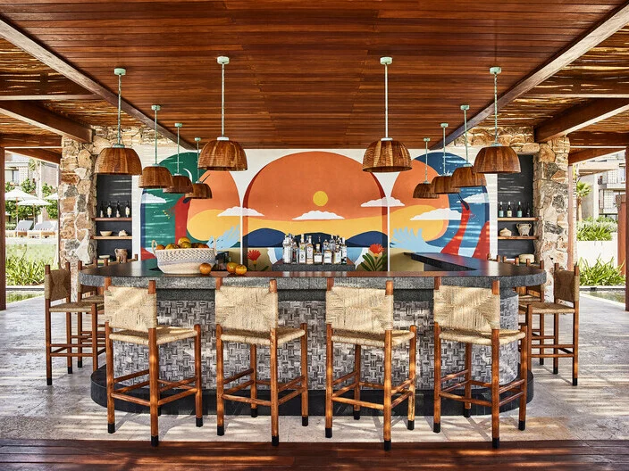 The bar features tropical cocktails crafted from fresh fruits, freshly pressed sugarcane juice, and a curated selection of tequilas and rums, offering a refreshing and vibrant complement to the poolside experience.