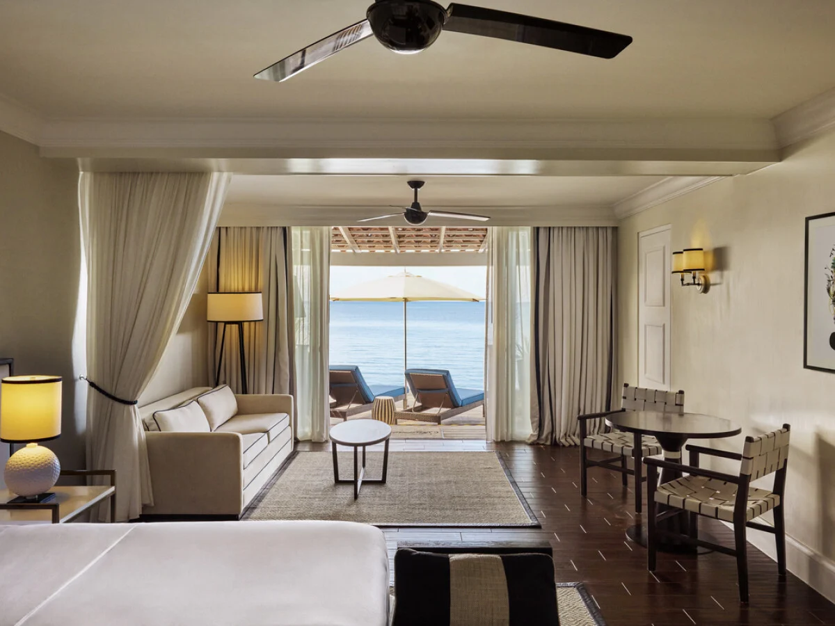 For the discerning guest looking for the ultimate in beachfront living, the relaxed, newly renovated, Beachfront Suites are open plan and ideal. The Beachfront Suites feature a private 250 sq. ft. furnished deck and outdoor living space directly overlooking the beach, perfect for entertaining or for a romantic candlelit dinner with the soundtrack of crashing waves. These suites have direct access to the resort's stunning half-mile beach. There is also a comfortable indoor seating area with a pullout sofabed ideal for one adult or two small children. The Beachfront Suite now includes daily complimentary Afternoon Tea. The Beachfront Suites are tastefully decorated in a warm tropical style and include a pillowtop king-size bed, a refreshment centre, an ample bathroom with shower and separate tub, and luxury personalized Le Labo toiletries.