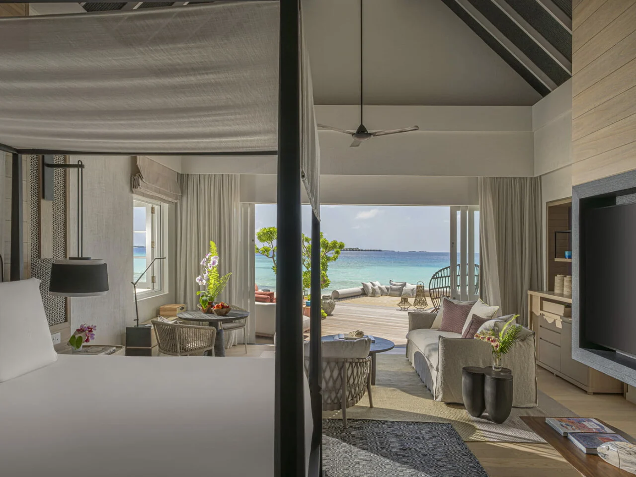 (2 units / interior 294m² / exterior 397m²) These suites are the ultimate in expansive over-water living for families and groups with sunken living rooms, semi-submerged sun loungers and vast open-sided rooms for unparalleled panoramic views.