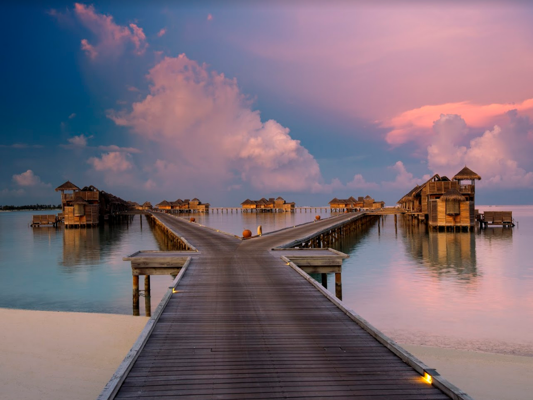 Perched at the end of our western-facing jetty, the Sunset Two-Bedroom Villa is an open-air oasis with unrivalled views of the surrounding seascape. The spacious master bedroom includes a semi open-air bathroom as well as an outdoor tub and shower. Two large, air-conditioned living rooms provide ample living (and extra sleeping) spaces. When guests are not dozing off in the sun, they can hit the private gym, steam room, or rooftop Maldivian swing. Or wander off the secluded Three Palm Island to unwind in a sumptuous cabana.