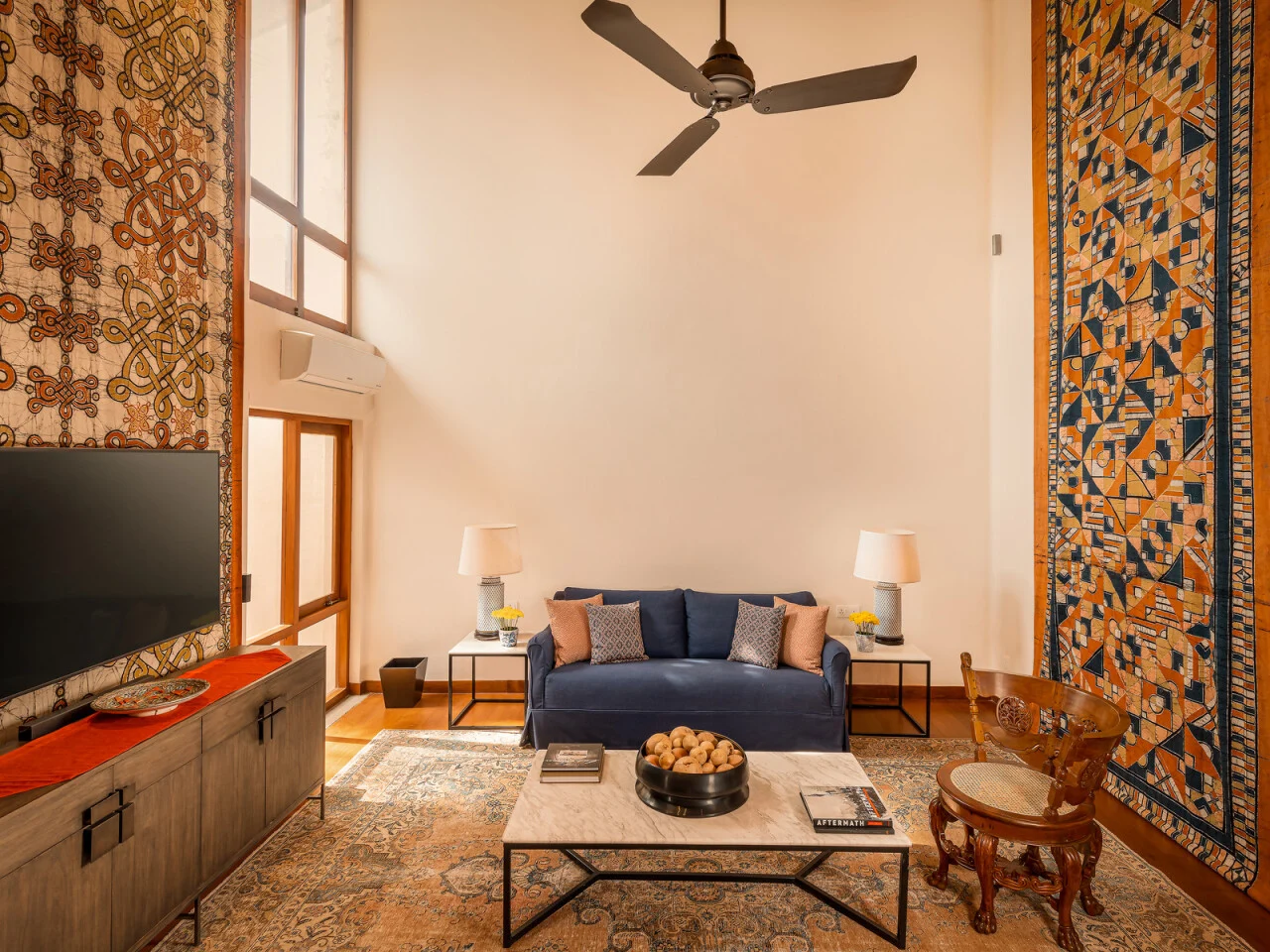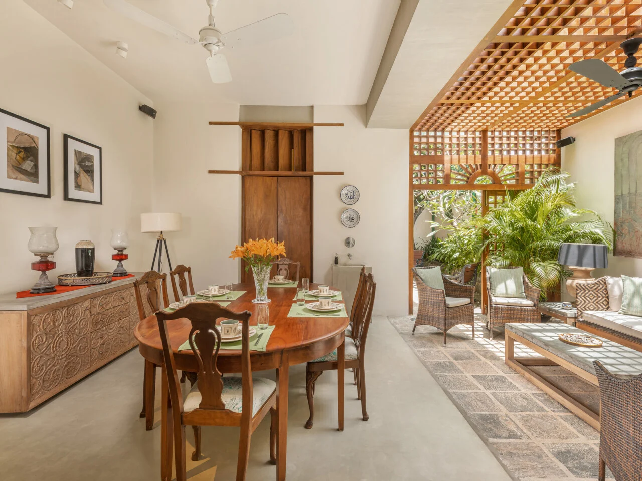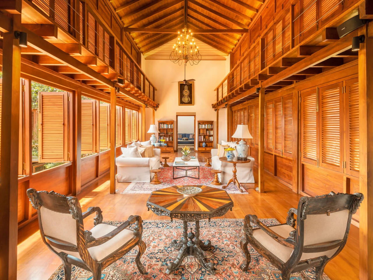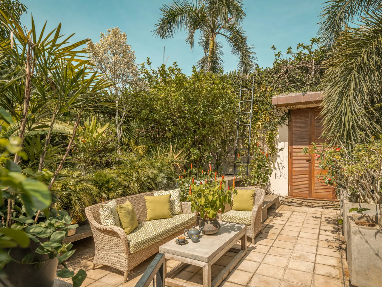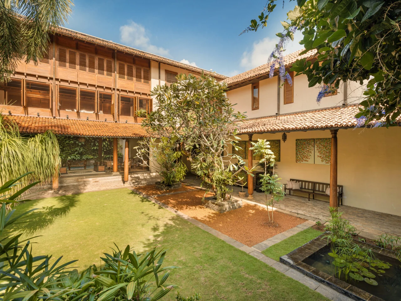 Master Suite One is a generous space located on the first floor of our private villa in Colombo. Accented by warm rugs and eye-catching wall hangings, the suite is furnished with a king-sized four-poster bed and has its own living room for you to relax more privately. Balcony railings allow the windows to be opened widely to the balmy outdoors where a view of the swimming pool shimmers below. This suite is also accessorised with a dressing room which leads into a luxurious ensuite bathroom with twin washbasins and a rain shower.
