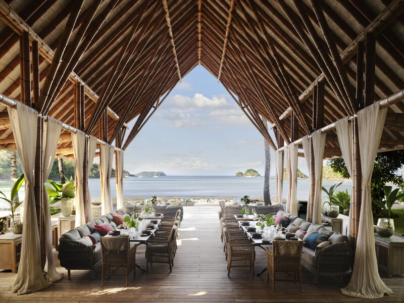 The vaulted structure that serves as the beating heart of Secas. Sample dishes at stylish open-air tables or inviting nooks under the soaring thatched roof. Romantic dinners are served beneath palms.