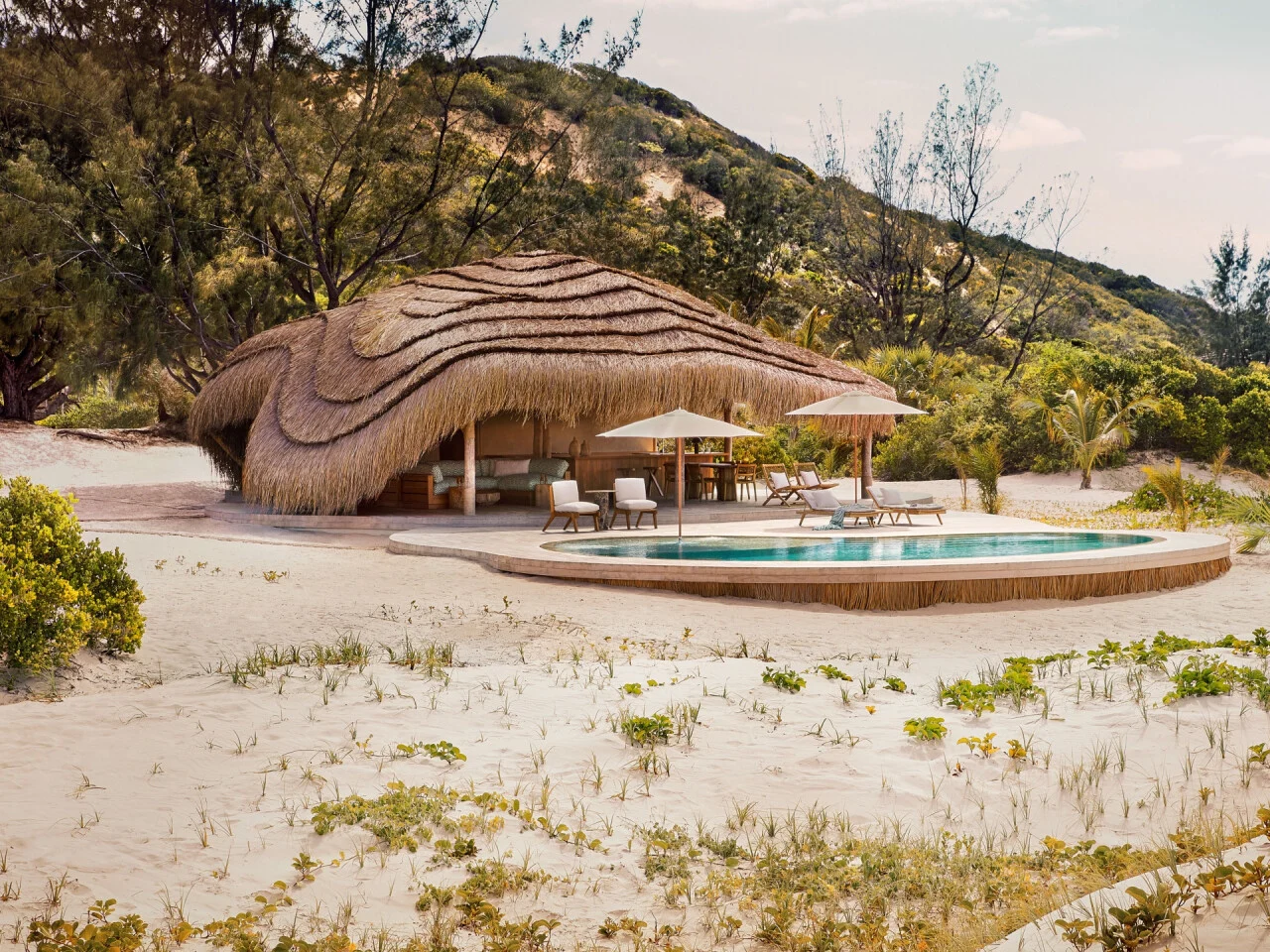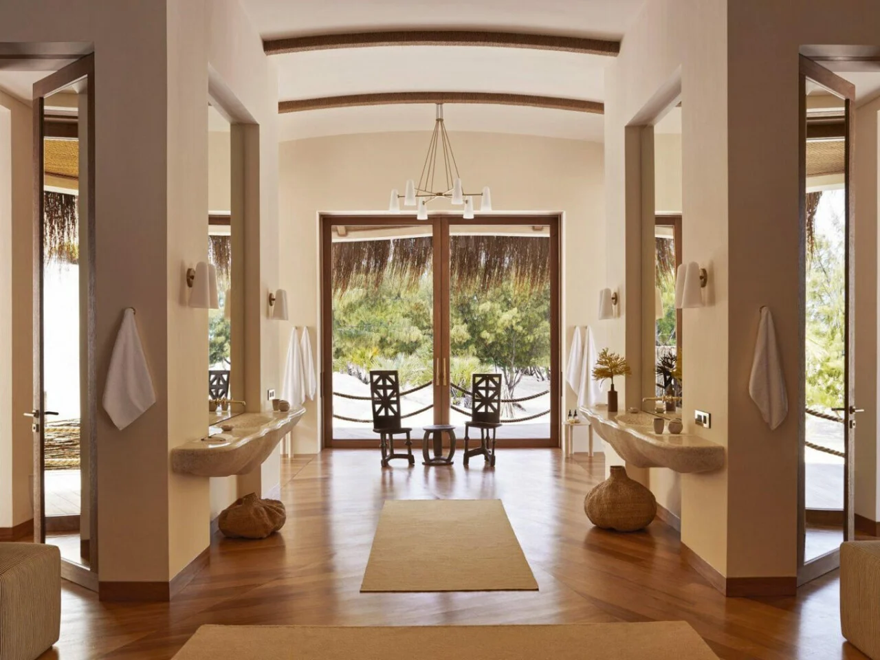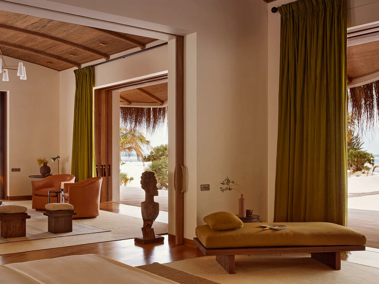 Two bungalows are connected via an open-air deck, with each bungalow featuring bespoke interiors, a generous living room, king bedroom, two dressing rooms and a joint bathroom. The founder's residence comes with a unique view of both the ocean and the cove sides of the island, a larger private plot and includes personal touches such as a pan-African antiques and art collection.