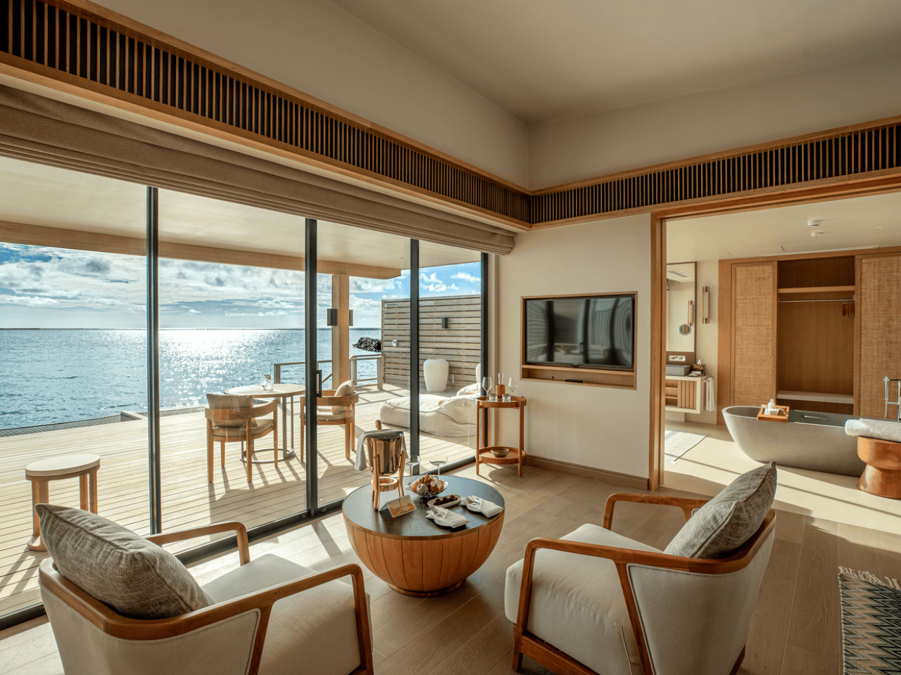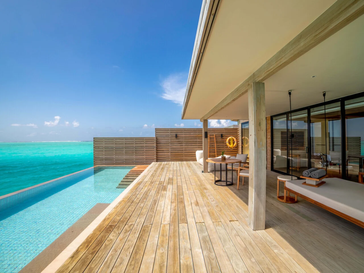 The luxurious Three-Bedroom Beach Residence with a Private Pool offers seclusion and is an ideal family vacation home. The airy tropical hideaway by the sandy beach surrounded by lush vegetation features three opulent master bedrooms, an inspiring living space to gather in for family moments, and a large swimming pool facing the crystal-clear blue lagoon.