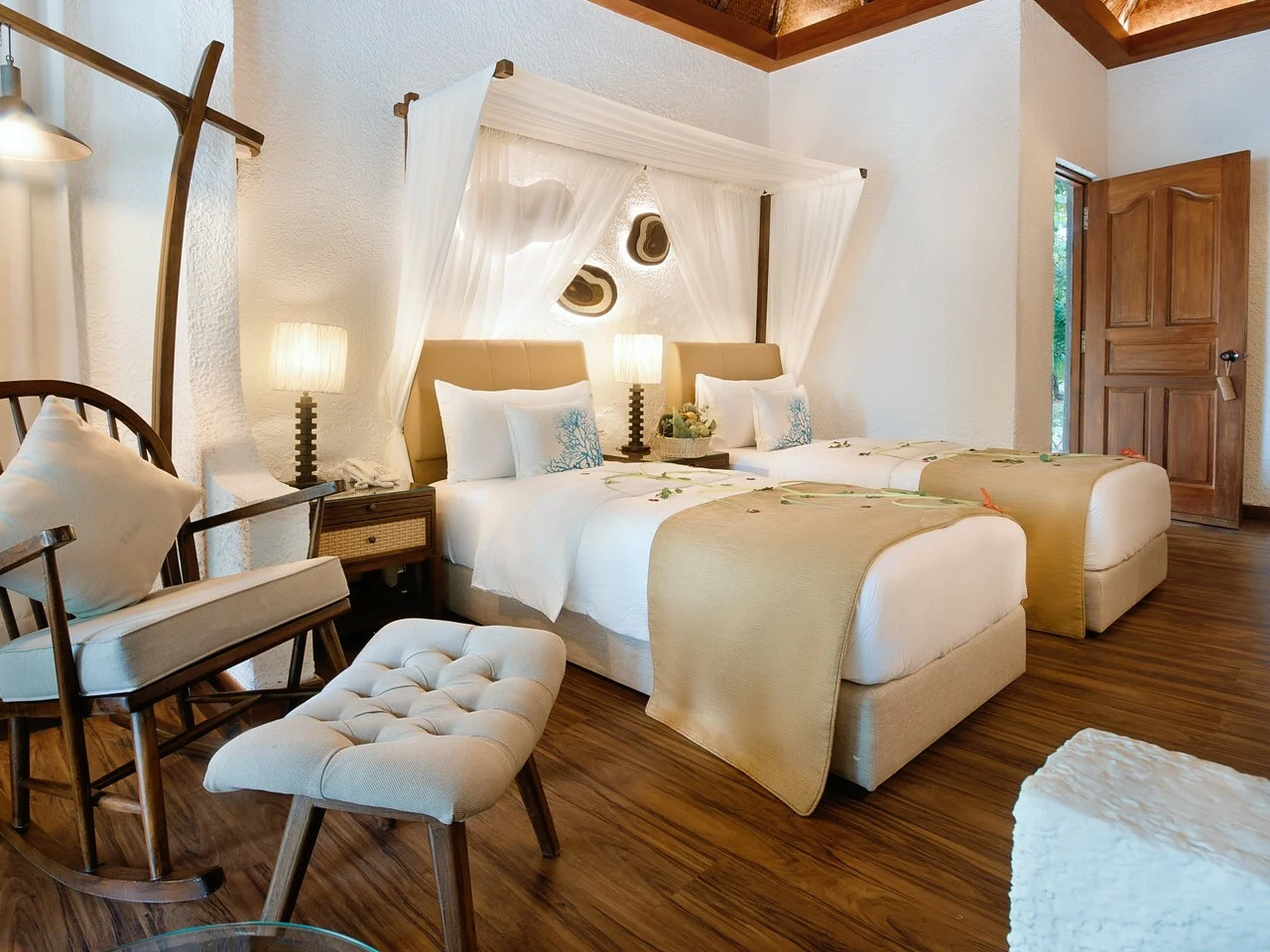 The 16 Deluxe Beach Bungalows offer a refined take on island living, combining comfort with natural surroundings. Each bungalow features a private patio with direct beach access and ocean views. Guests can enjoy an open-air shower set within a secluded, tropical setting. Daily amenities include afternoon canapés delivered to the bungalow and complimentary sundowners at the Sunset Bar.
