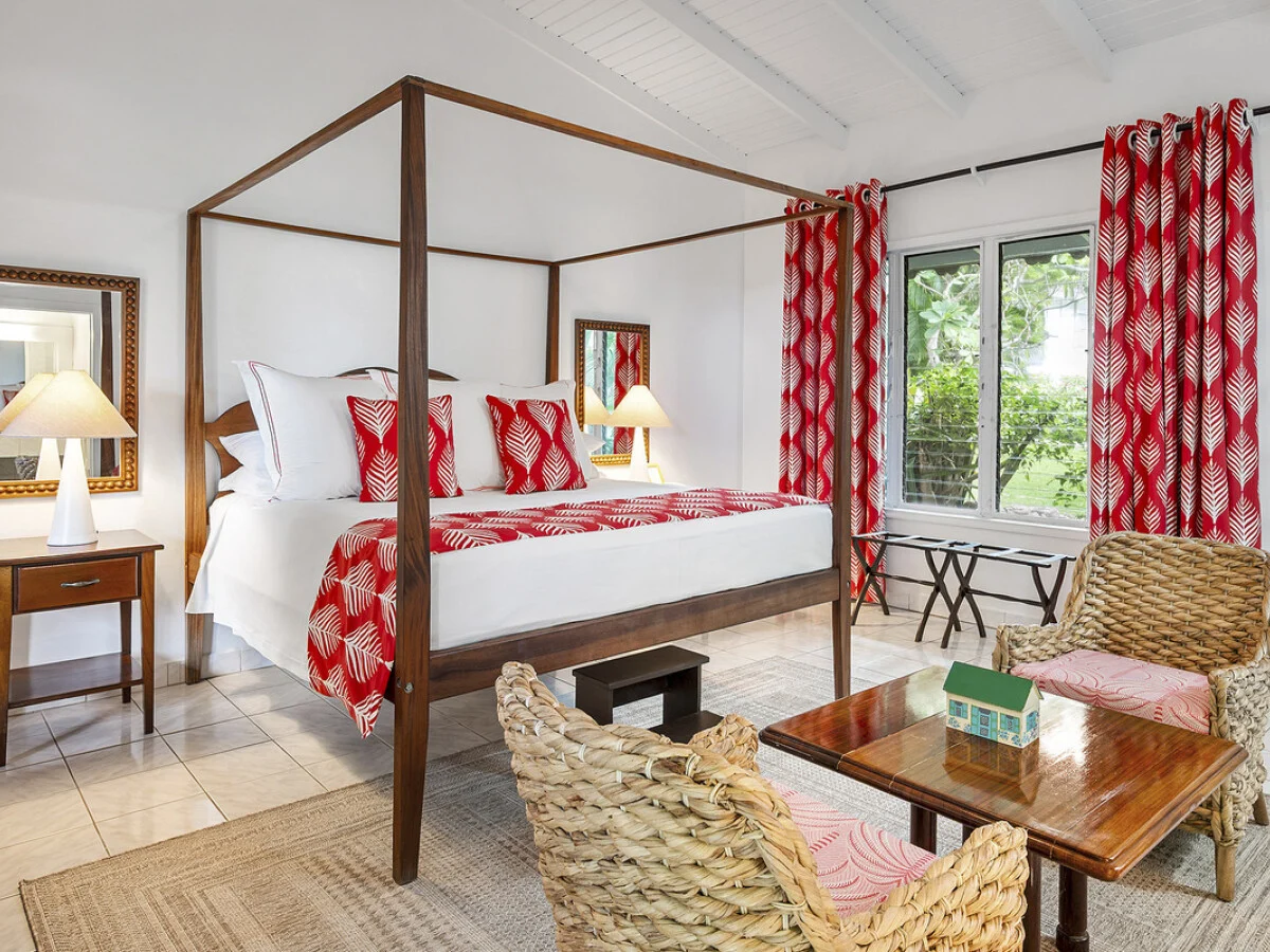790 square feet. Surrounded by tropical vegetation, the Garden Suite is all about nature – with fresh contemporary touches – and features a large terrace, interior sitting area with a wet bar and expansive floor-to-ceiling glass windows looking out to the islands beyond Nevis. The look is completed with a four-poster bed, gleaming bamboo floors and a bathroom with a rainfall shower.
