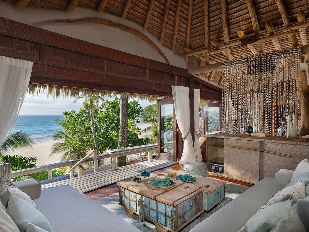 Villa North Island, also known as Villa 11, sits atop a granite cliff on East Beach, offering unmatched privacy. This expansive 750 sqm (8,000 sq. ft) villa spans multiple levels and features a discreet entrance through a coconut grove. Guests can walk down a wooden deck with a waterfall leading to the beach, creating a secluded, castle-like atmosphere.