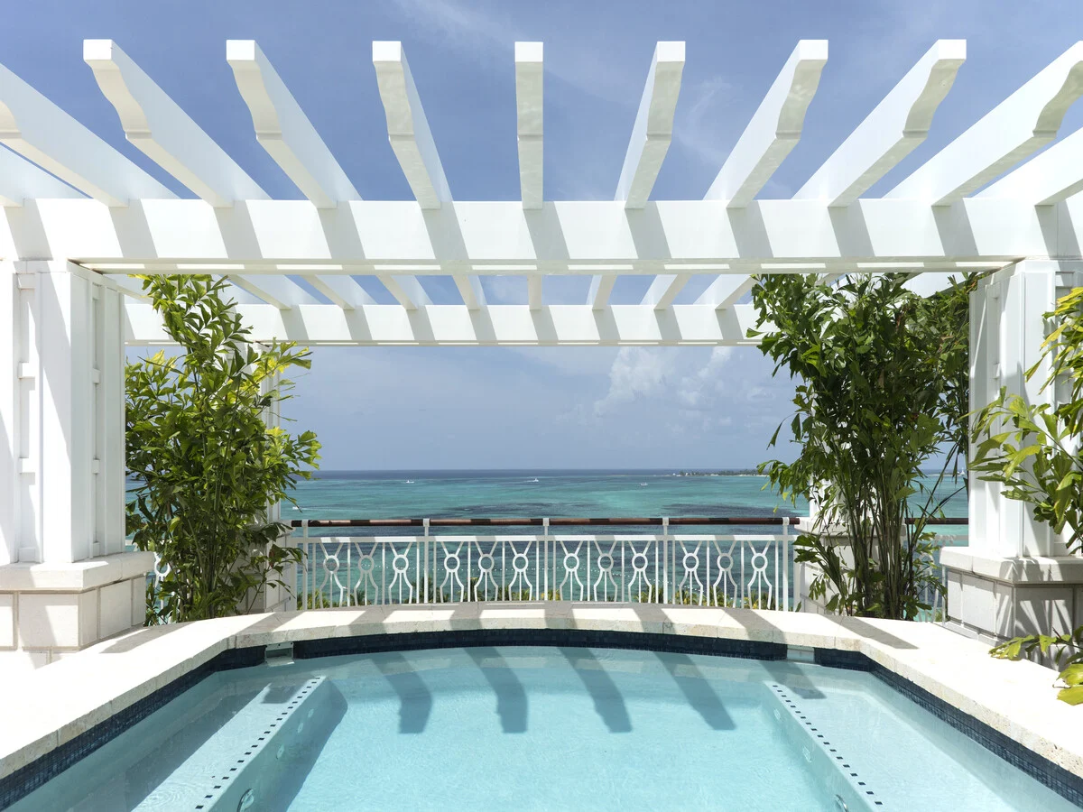 Explore paradise in our expansive 1,455-square-foot suite, distinguished by an oversized ground-floor terrace with outdoor dining area offering lush tropical views and an inviting atmosphere with Bahamian flourishes. The suite features an oversized living room, separate interior dining room, and fully equipped kitchen for residential-style comforts. Revel in serene luxury with the full marble bathroom – all amidst captivating Bahamian art and exquisite décor.
