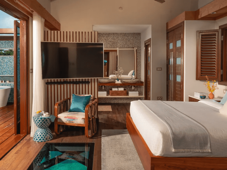 These gorgeous over-the-water bungalows convey an intimate connection to the Caribbean Sea and deliver complete immersion of the fine turquoise waters and rich marine life below. Glass floor panels and lit water ensure guests can enjoy undersea views at any time. Couples can also admire the beauty of the ocean from their private outdoor Tranquility Soaking Tub for two or over-water hammocks. Every bungalow captures the height of luxury with hardwood floors, vaulted ceilings, custom-crafted king-size beds adorned with soft linens and plush pillows for the ultimate sleep experience. Inside, each bungalow is equipped with a smart TV and a large ceiling fan to stay cool while enjoying fresh Caribbean breezes. The bathrooms are equipped with his and hers sinks, a large backlit mirror adorned with mosaic tile, and a walk-in rain shower. Outside, the private patio is also equipped with an extended sun deck, outdoor shower, sun loungers, and a bistro set for two. The Butler Elite service, which handles every detail of guests vacation with unobtrusive grace, private airport transfers and 24 hour room service is included to complete the over-water vacation.