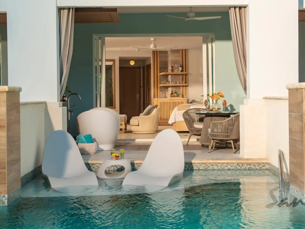 Located on the ground floors of the Azure, Sunburst, Yellowfin, Starfish and Loggerhead buildings, these spectacular suites boast a large private patio with Tranquility Soaking Tub for two and direct, zero-entry access into a Crystal Lagoon pool. A spacious interior features elegant furnishings, a king-size bed, HD smart TV and a comfy sitting area. The en-suite spa-style bathroom is outfitted with a double basin vanity, dual-control walk-in rain shower, and backlit mirrors.