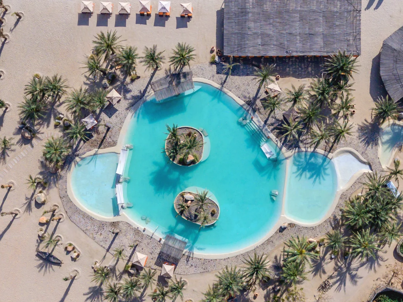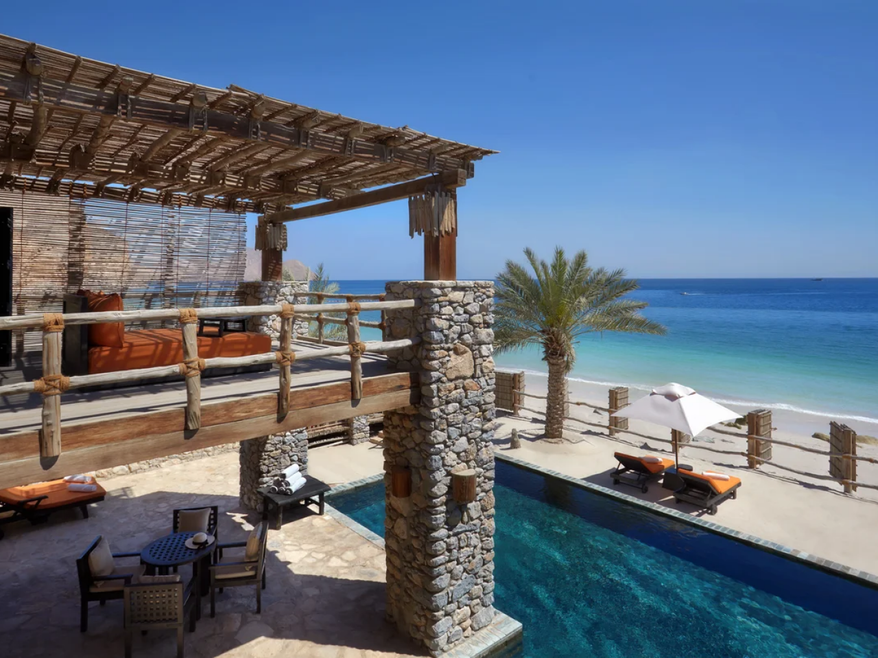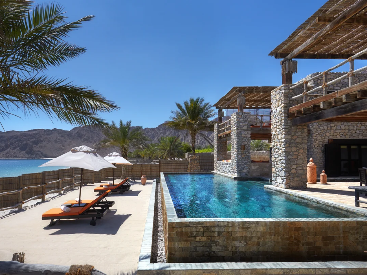 A beachfront private pool villa in Oman built of materials sourced from around the region, the Omani enclave invites you to unwind in the cool indoors under high ceilings, in the colourfully cushioned living area, or on your bed made with soft cotton sheets topped with your choice of ergonomic pillows and a gentle fragrance if you wish. Refresh outside within the privacy of high mountain-stone walls, on your plumped-up sun loungers, shaded dining area by or in the private swimming pool.