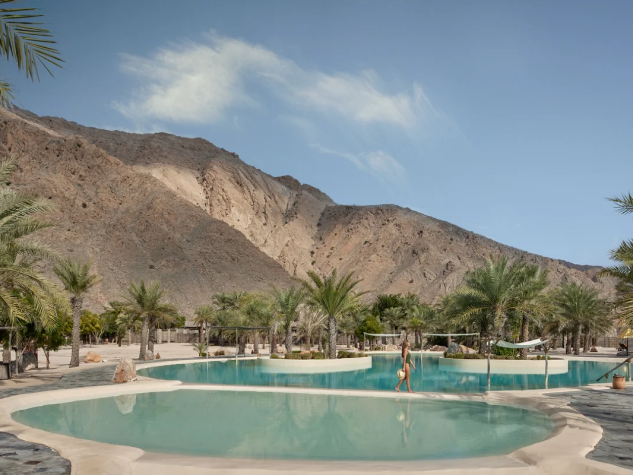 An oasis built of materials sourced from around the region, the Omani enclave invites you to unwind in the cool indoors under high ceilings, in the colourfully cushioned living area or on your bed made with soft cotton sheets topped with your choice of ergonomic pillows and a gentle fragrance if you wish. Refresh outside within the privacy of high mountain-stone walls, on your plumped-up sun loungers, shaded dining area by or in the private swimming pool.