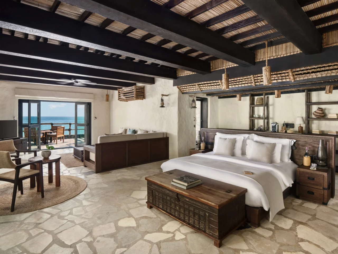 Six Senses resort in Oman features an extra spacious hideaway with separate bedroom and living, a beachfront oasis built of materials sourced from around the region, the Omani enclave invites you to unwind in the cool indoors under high ceilings, in the colourfully cushioned living area or on your bed made with soft cotton sheets topped with your choice of ergonomic pillows and a gentle fragrance if you wish. Refresh outside within the privacy of high mountain-stone walls, on your plumped-up sun loungers, shaded dining area by or in the private swimming pool.