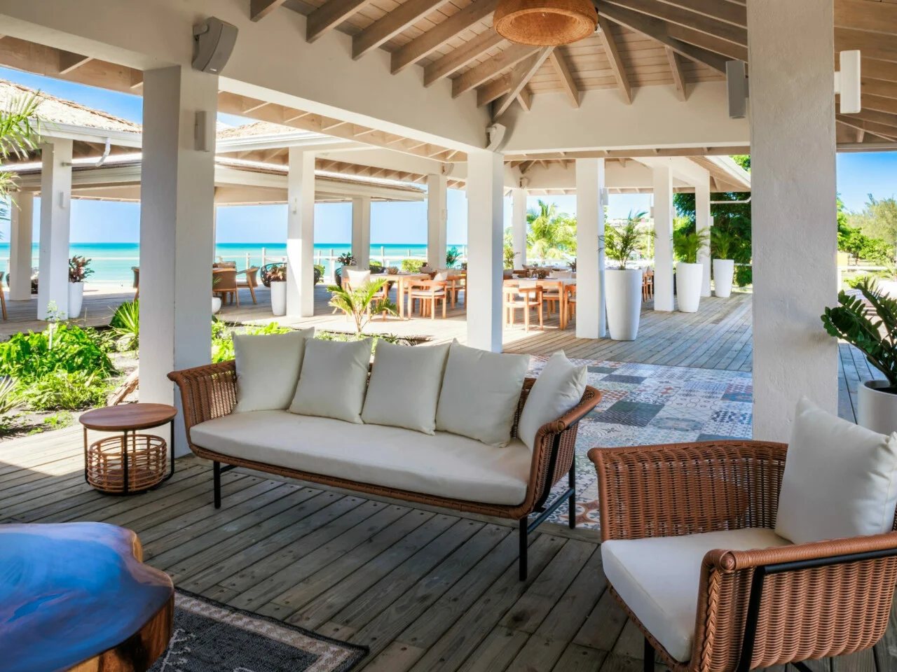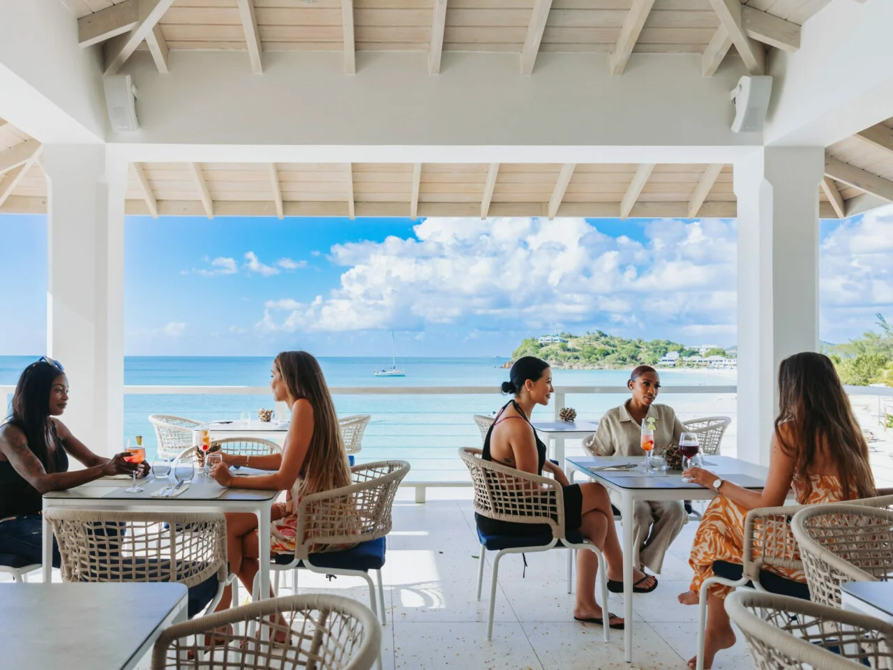 The Terrace is an upstairs restaurant with sweeping views of the Caribbean Sea. Guests can enjoy breakfast in a tranquil setting, afternoon tea with light bites, and Mediterranean-inspired tapas in the evening, all with stunning sunset views.