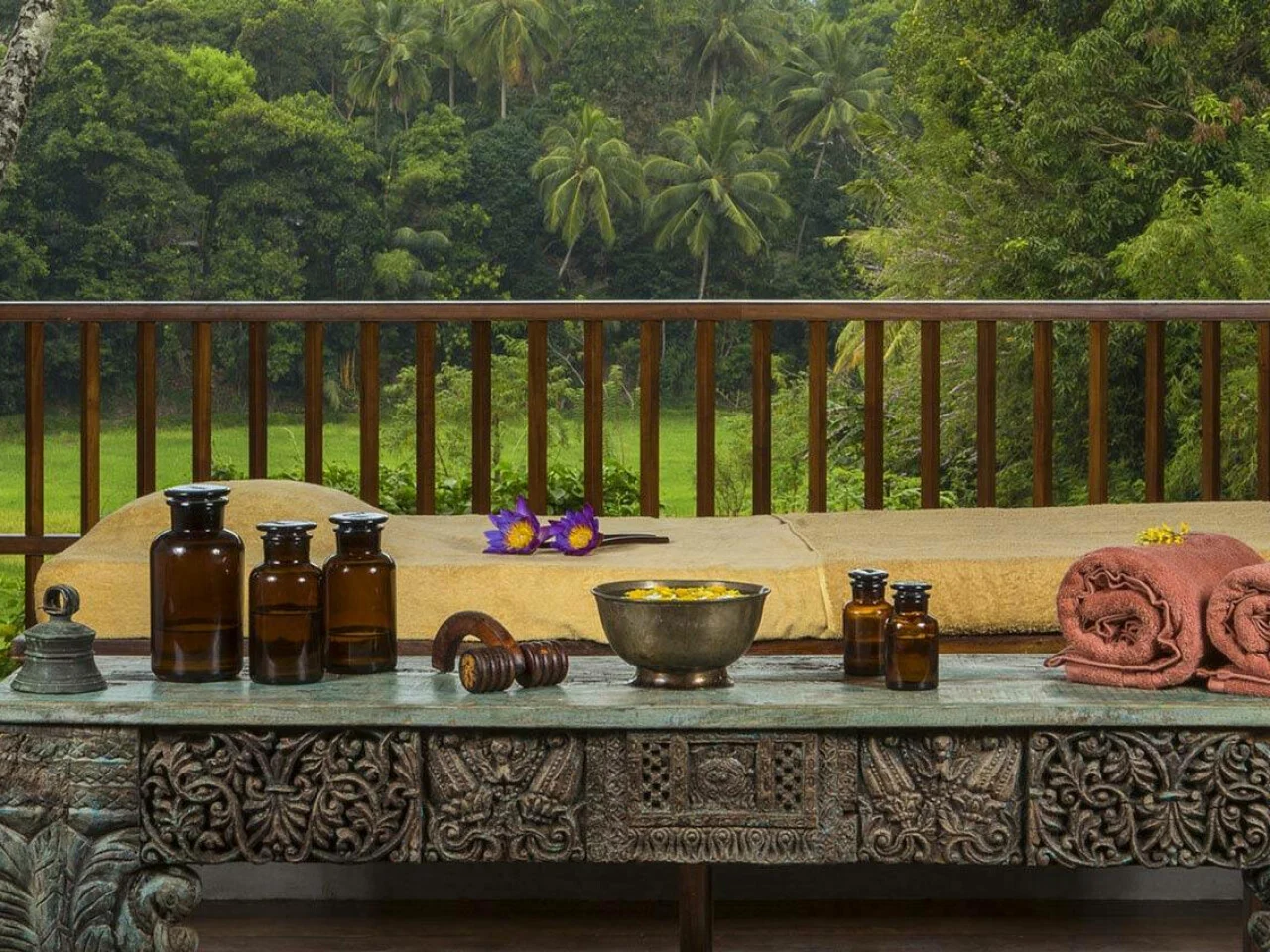 Spacious double room on the upper floor with views of luscious green paddy fields and the infinity pool and butler services, Luxurious bathroom with an old fashioned cast- iron bathtub as well as a separate shower, WC, and twin vanities, Four-poster king-size bed, Private balcony for dining, sofa, large cupboard and other antique furniture.