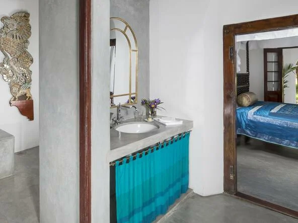 Distinctive double room with arched doors opening onto an outdoor veranda, with an octagonal stone bath feature and butler services, Separate shower, WC, and twin vanities, Four-poser king-size bed, Outdoor veranda for dining, sofa, large cupboard and other antique furniture with a double swing-hammock in a “secret” garden nearby. Can be booked with adjoining deluxe double bedroom, Monkey Puzzle.