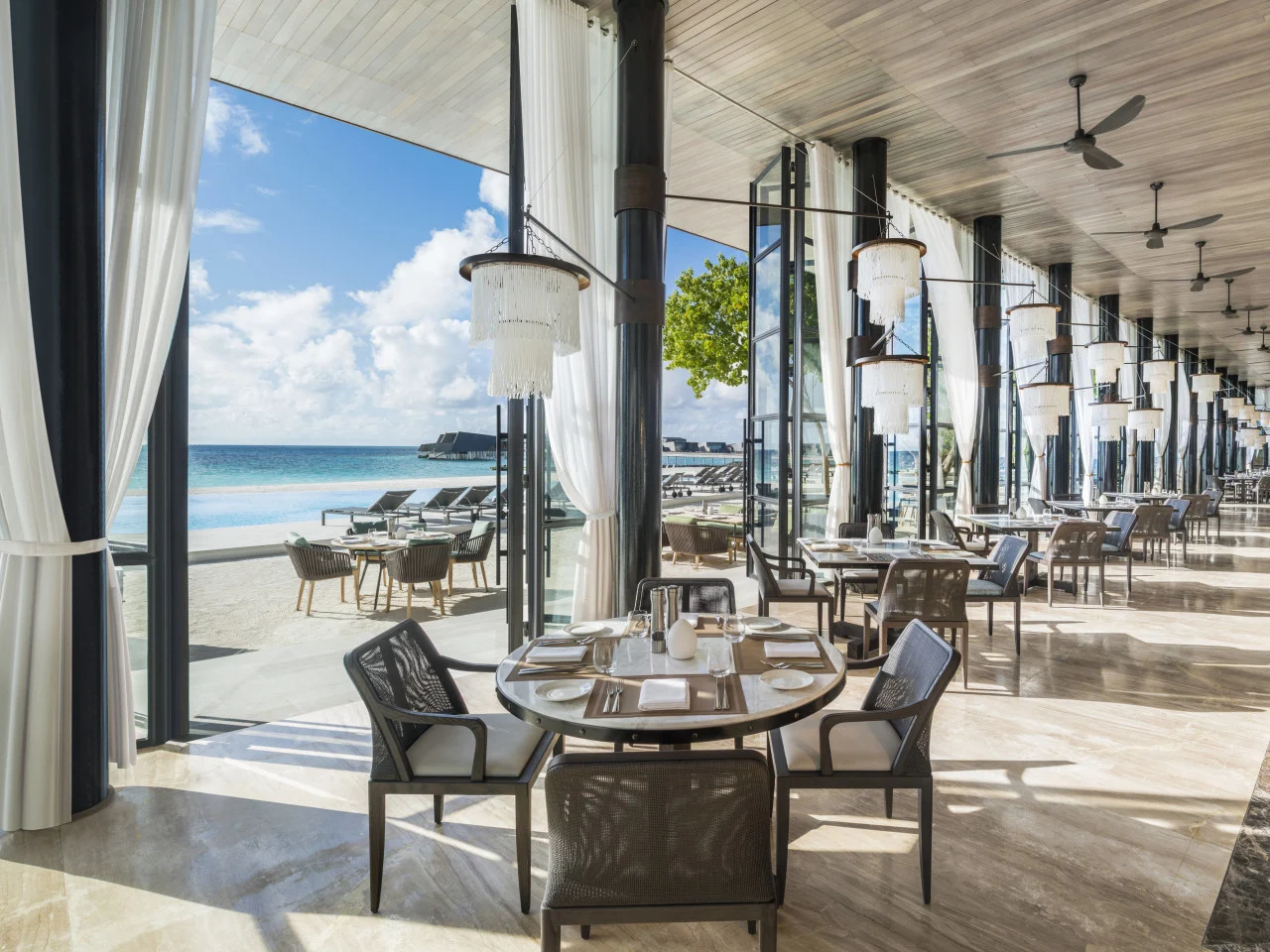 Conveniently located near the resort's house reef, Overwater villa with Pool offers a private pool and floor-to-ceiling views of the Indian Ocean. The expansive outdoor terrace frames a 16-square meter private plunge pool, daybeds, sun loungers and hammocks. Soft interiors with plenty of natural light makes the villa an enticing retreat.