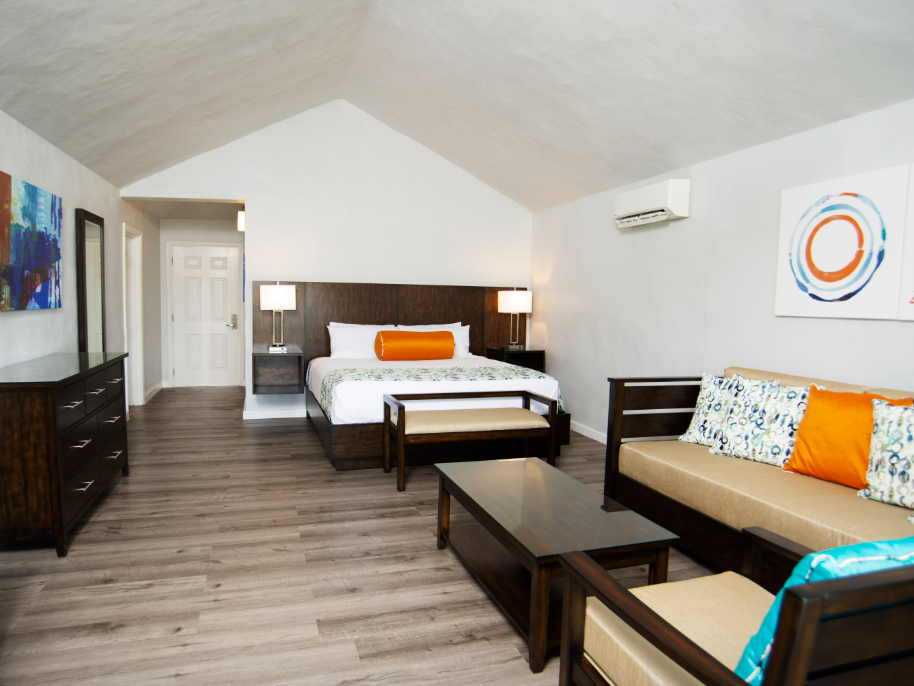 Equipped with one king bed, sleeps up to two adults. These suites come with stunning beach and ocean views.