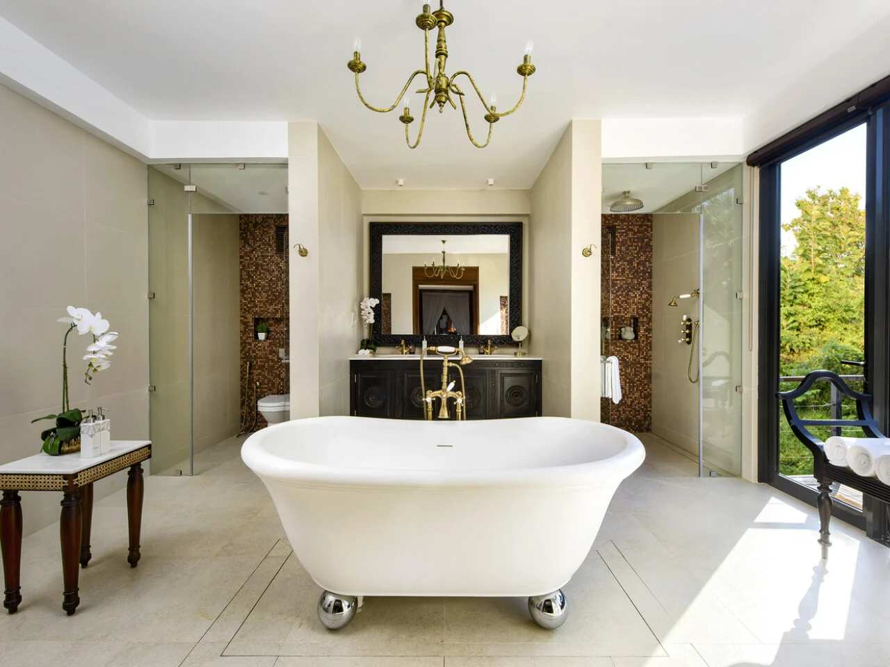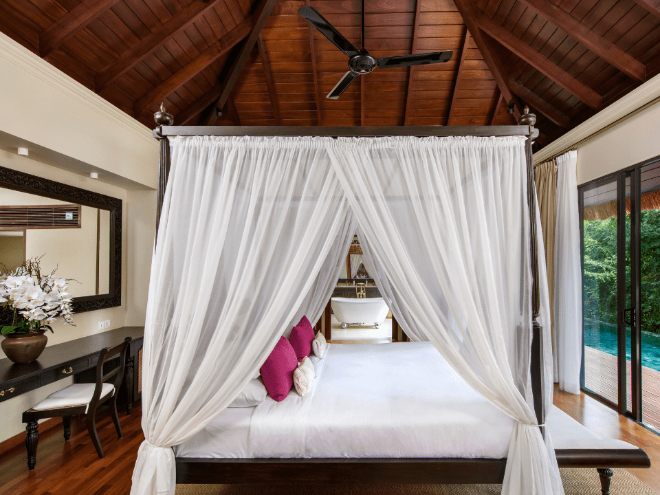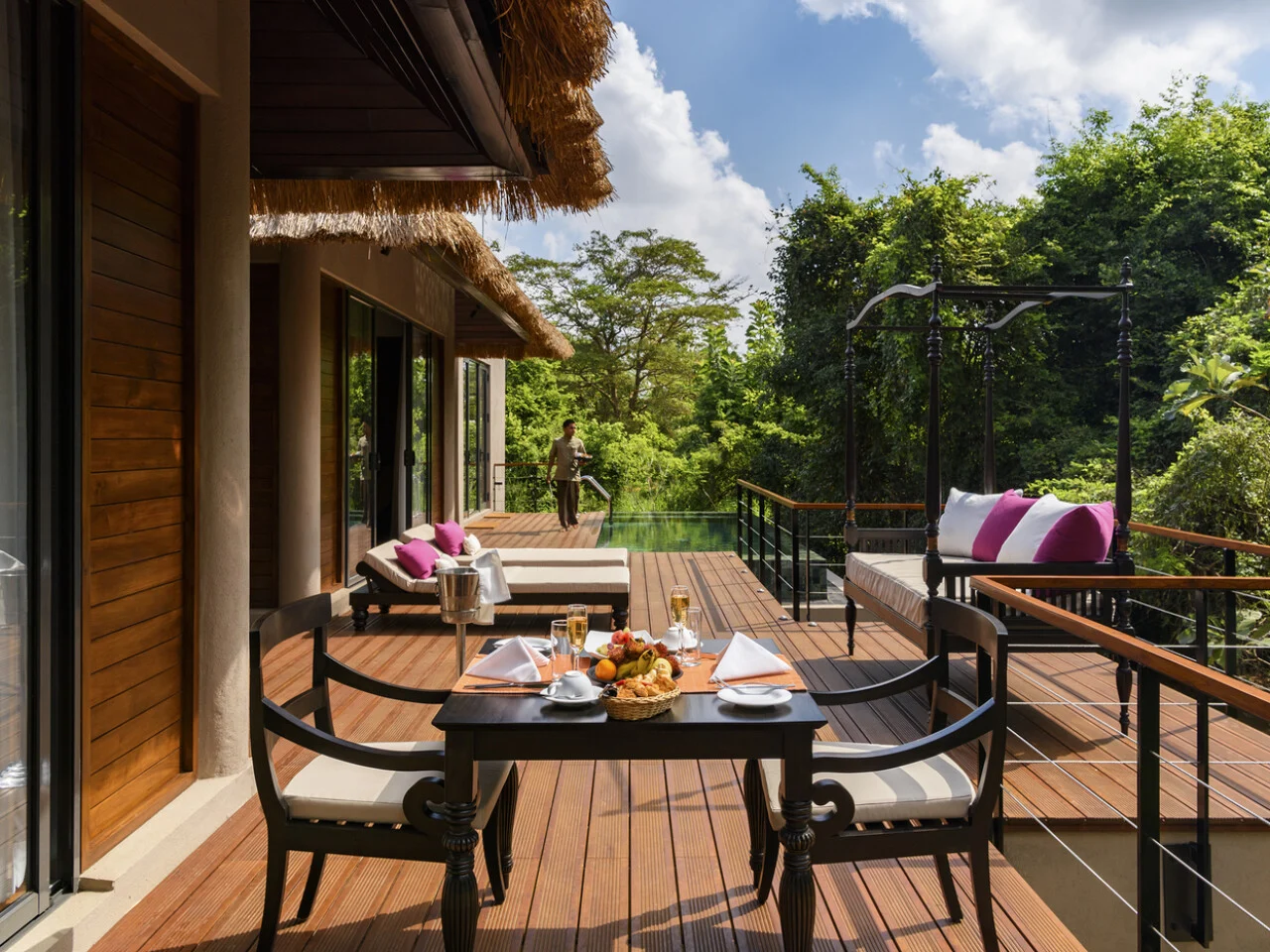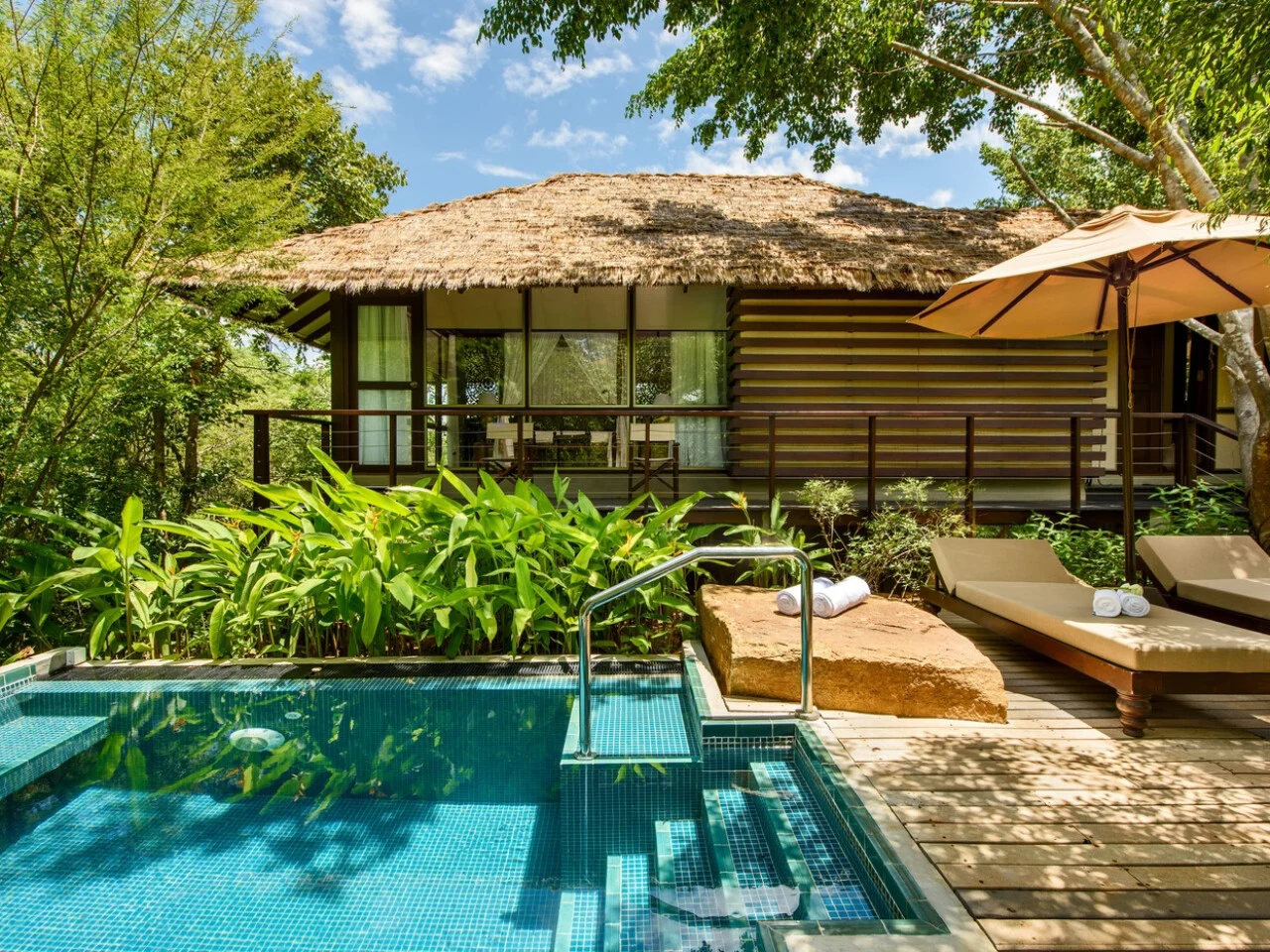 The deluxe villas at Uga Ulagalla offer 2,100 square feet of intimate comfort and serene natural surroundings. Inside, a spacious bedroom with a dressing area leads to an elegant bathroom with both a shower and bathtub. The large living room connects to a 700-square-foot outdoor deck with day beds, a second bathroom, dining space, and a plunge pool. Ideal for couples, these villas are also family-friendly, making them a perfect retreat for all.